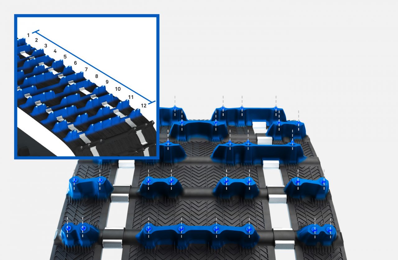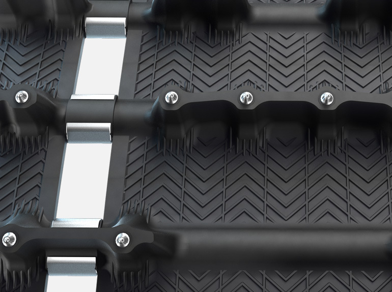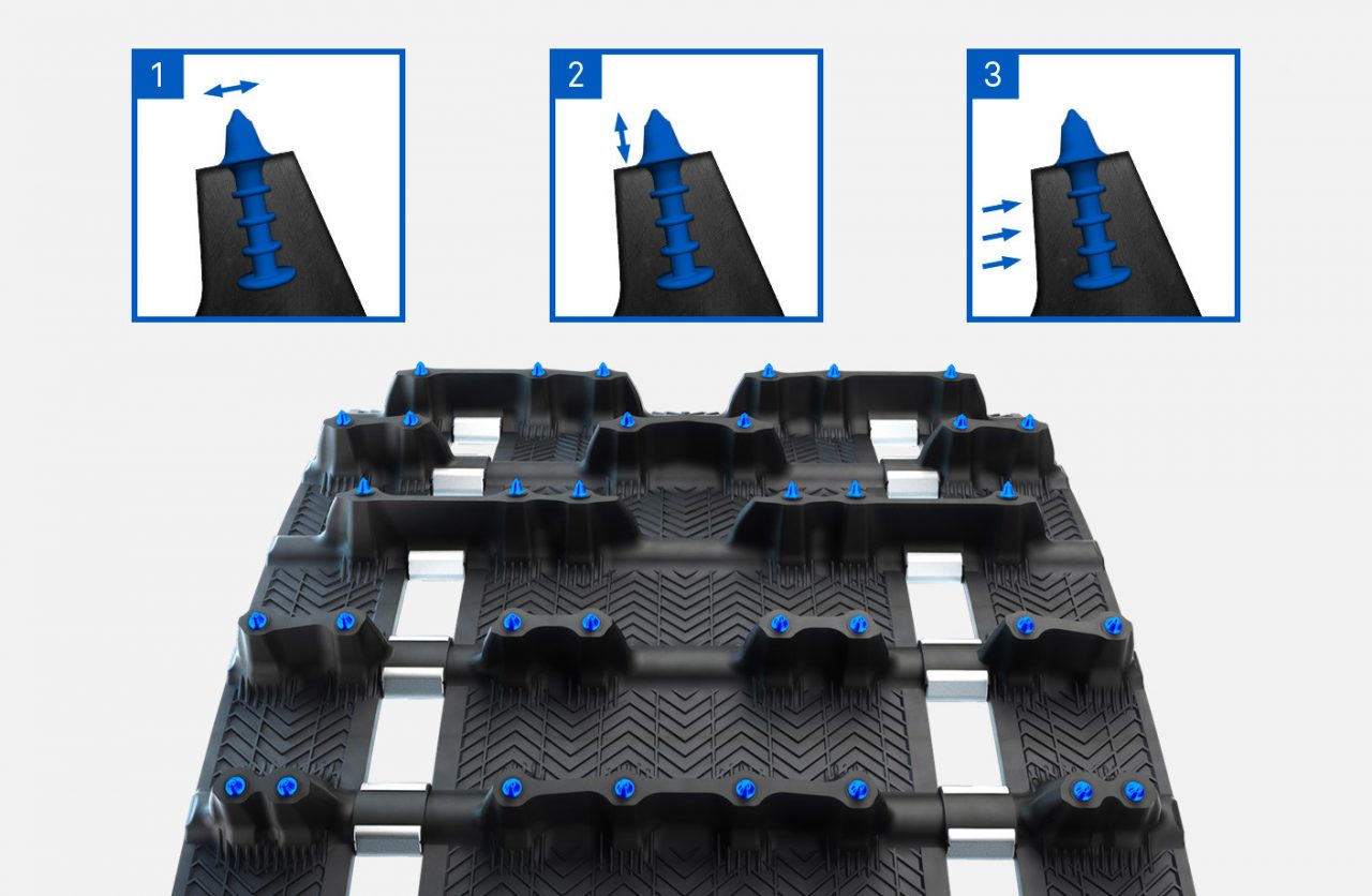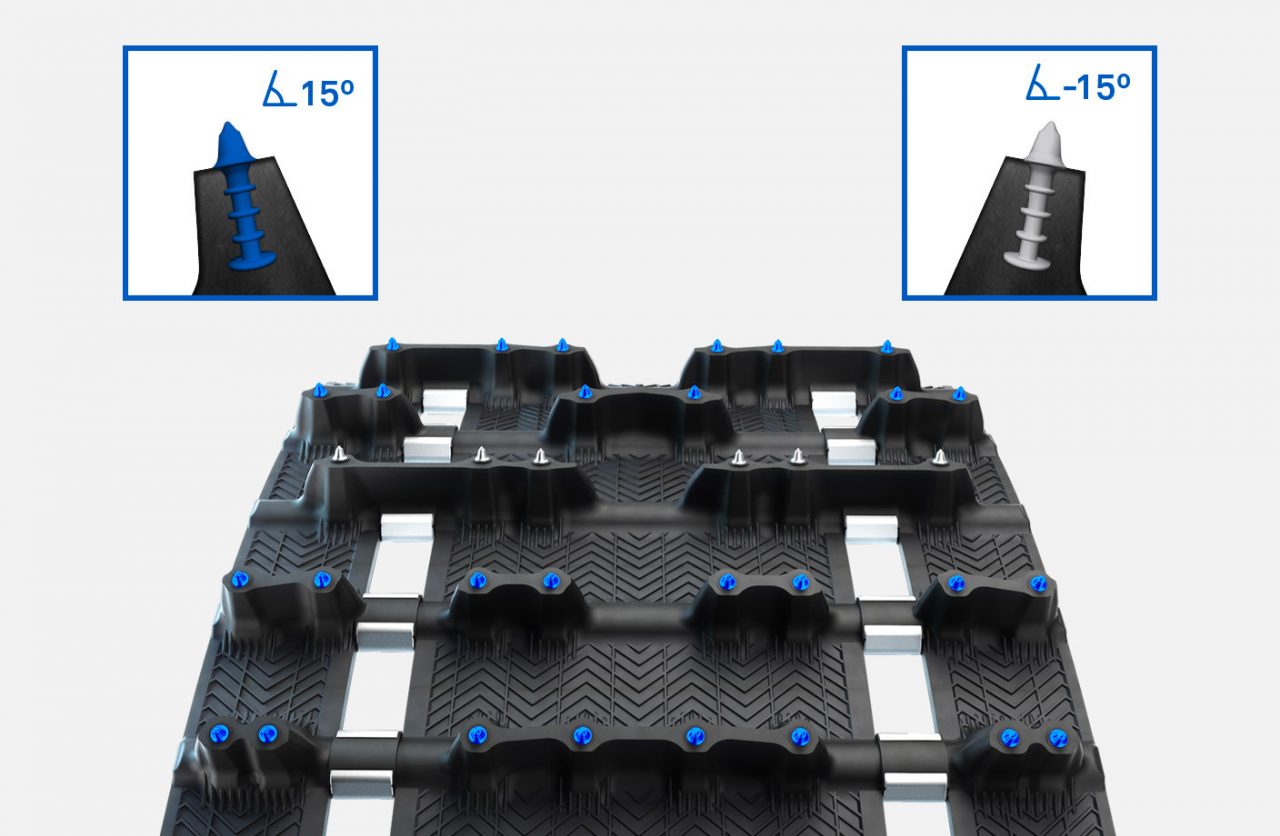 Our first ICE track with studs at an optimized 15° attack angle for more efficiency, without compromising on strenght or weight. Developed to ensure safety, performance, great handling and acceleration in slippery or severe trail conditions.