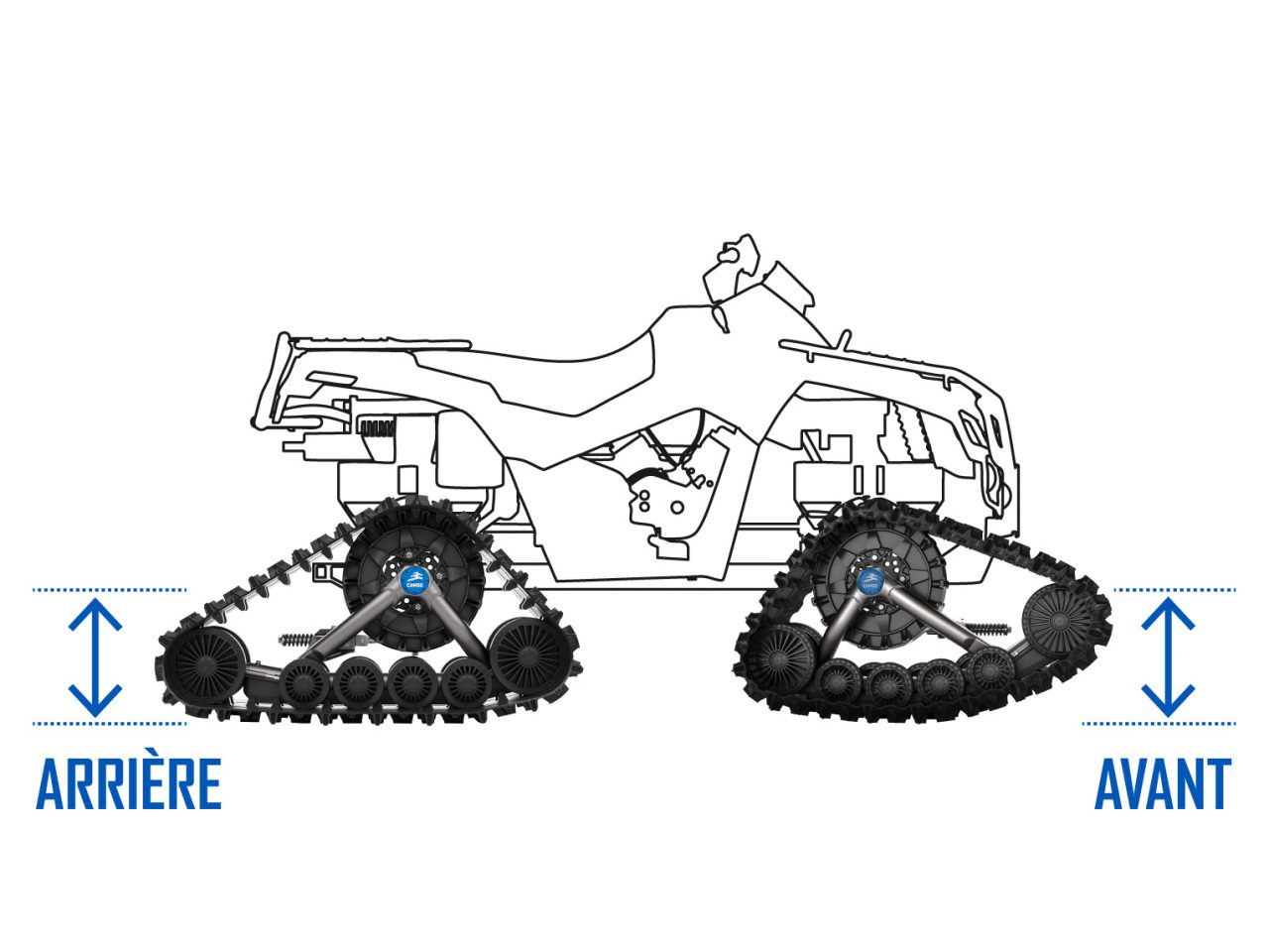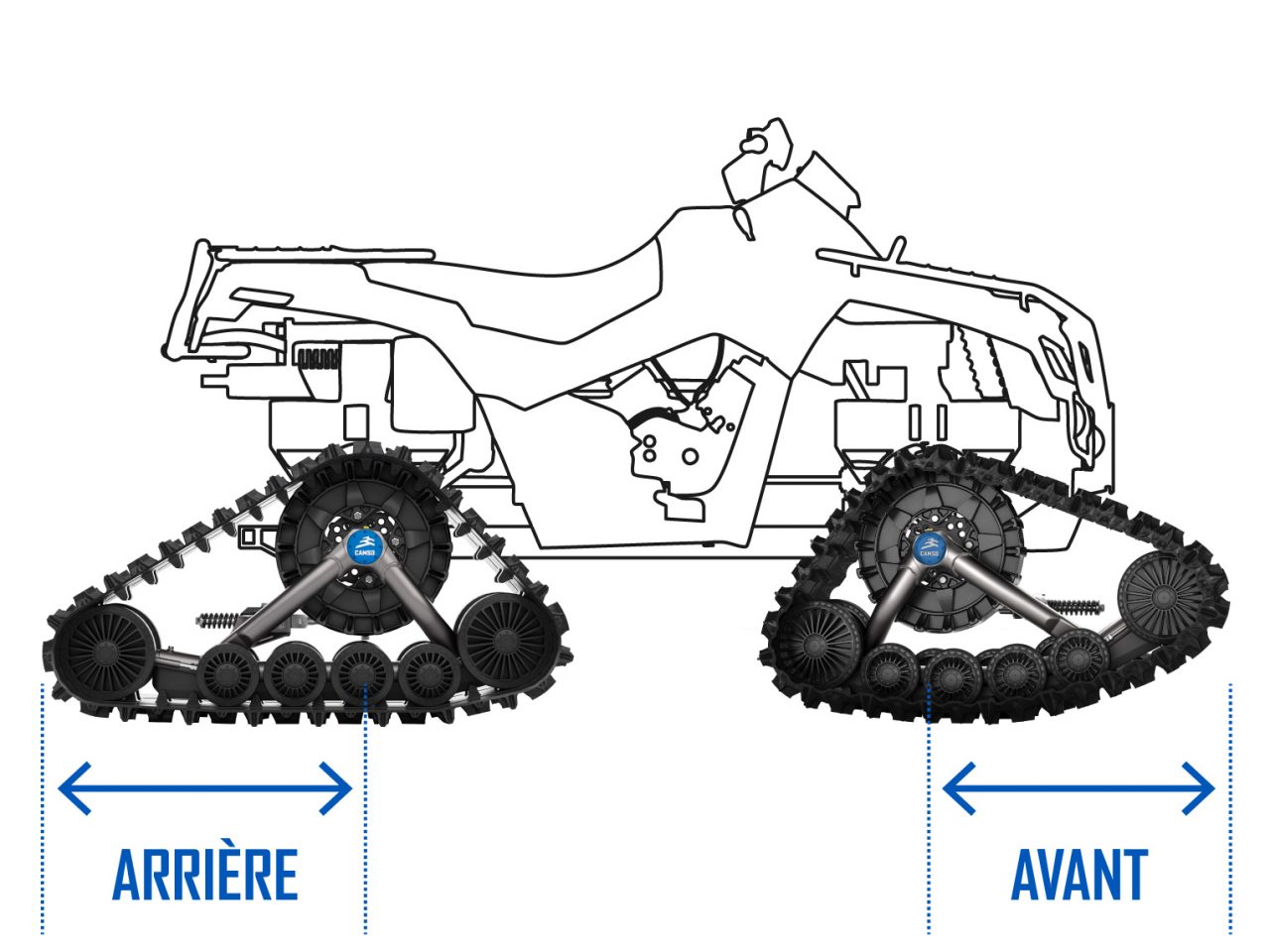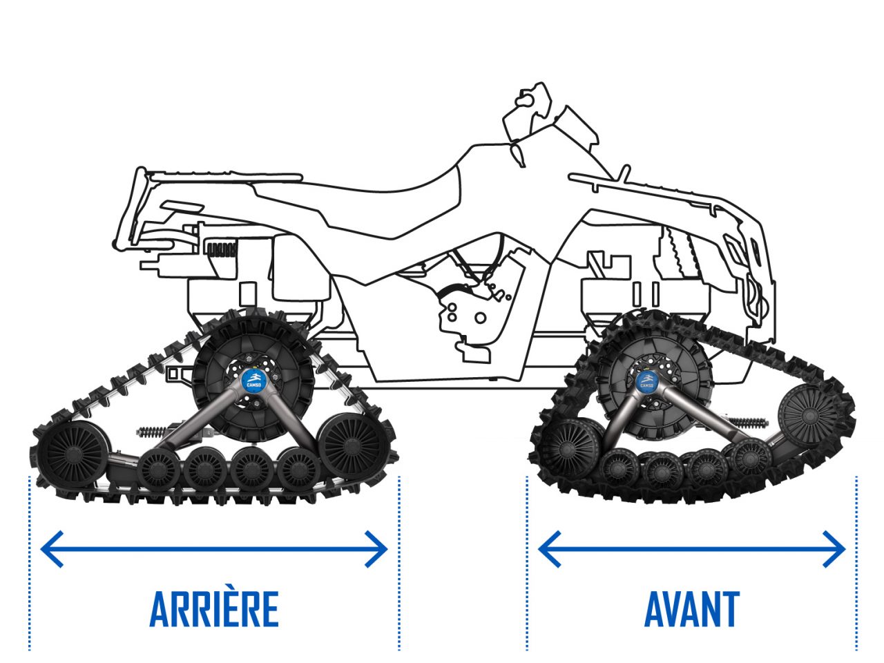 Conçu pour le travail et le loisir, ce système de chenilles est le plus versatile. Avec une stabilité et tenue de route améliorées, aventure-toi avec confiance dans les côtes abruptes et la neige profonde. S'adapte sur les VTTs et les VCCs moyens.